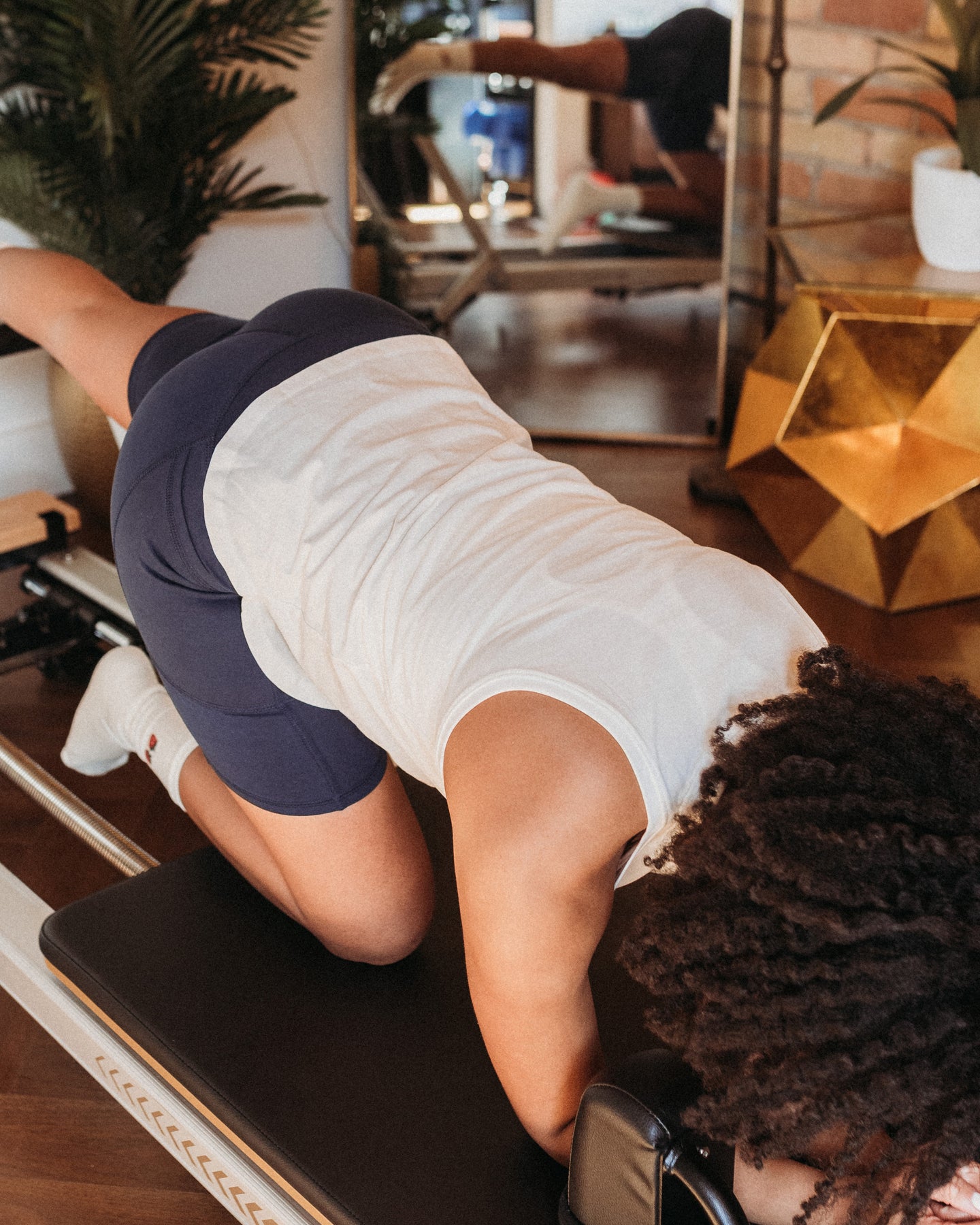 Person exercising using a Pilates reformer machine in a home setting.